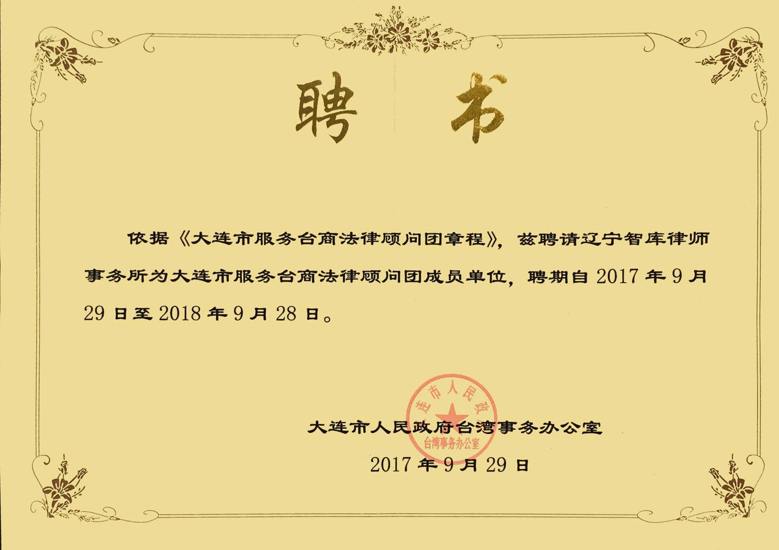 2017年9月智库所聘为大连市服务台商法律顾问团成员单位
